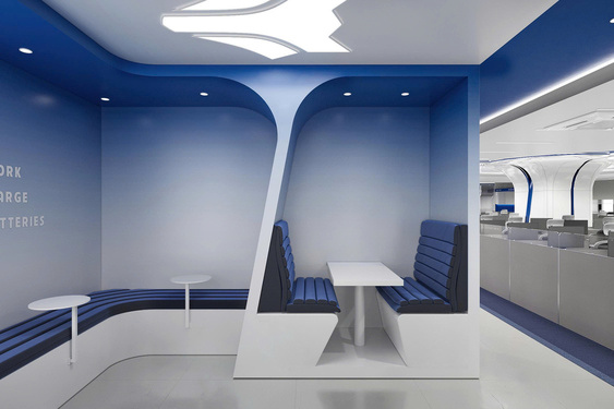Không gian hệ hình khối bo cong liên tục, xuất hiện ở trần, tường, quầy lễ tân và khung cửa kính. Các đường cong mềm mại, liền mạch tạo chuyển động thị giác liên tục, dẫn dắt ánh nhìn và cảm xúc, mang lại sự thân thiện, thư giãn cho khách hàng ngay khi bước vào